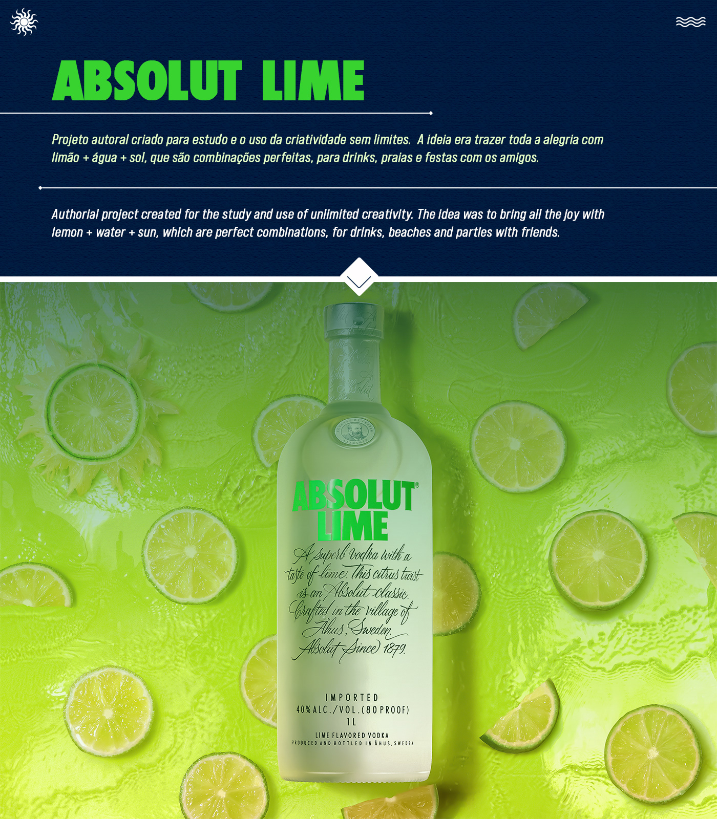 Este projeto foi feito a partir de ideias com o tema de bebidas, já que acho as garrafas e toda a identidade da vodka Absolut super bem construídas, bonitas e cheias de carisma. Então peguei minha Nikon, meus flashes e fui a luta fazer umas fotos com esse tema de limões, sol e água. E saiu essa foto que vocês viram no projeto. Gostou? fique a vontade para comentar, curtir ou usar como referência. Obrigado pela visita! ------------------------------------------------------------------------------------- This project was made from ideas with the theme of drinks, as I think the bottles and the whole identity of Absolut vodka are super well built, beautiful and full of charisma. So I took my Nikon, my flashes and went to fight to take some photos with this lemon, sun and water theme. And this photo that you saw in the project came out. Did you like it? feel free to comment, like or use as a reference. Thanks for the visit!